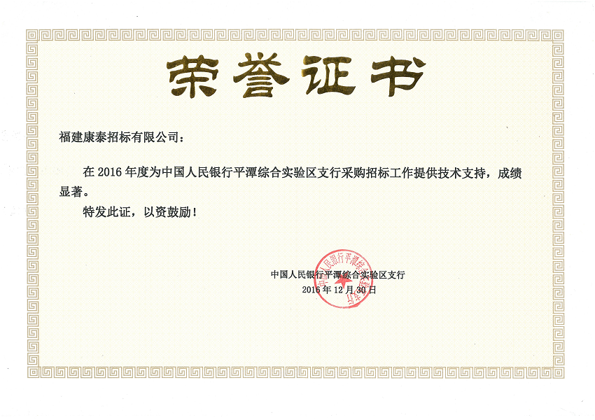 中國銀行平潭綜合實驗區支行授權榮譽證書